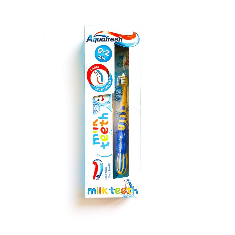 Szczoteczka do zębów Aquafresh Milk Teeth została specjalnie opracowana przez lekarzy dentystów dla dzieci w wieku 0-2 lat, aby pomagać w dokładnym szczotkowaniu mlecznych zębów. Miękkie włókna o różnym nachyleniu otaczają każdy ząb. Elastyczna rączka szczoteczki wygina się absorbując nacisk podczas szczotkowania.