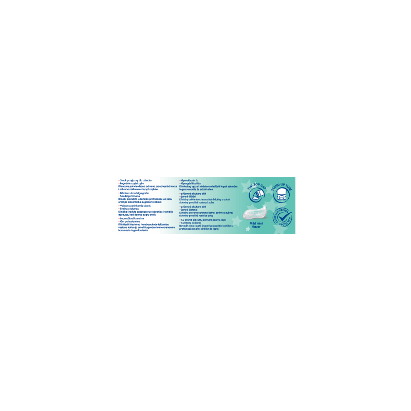 Przeciwpróchnicza pasta do zębów dla dzieci. Smak przyjazny dla dziecka. Łagodnie czyści zęby. Klinicznie potwierdzona ochrona przeciwpróchnicza i ochrona szkliwa rosnących zębów.