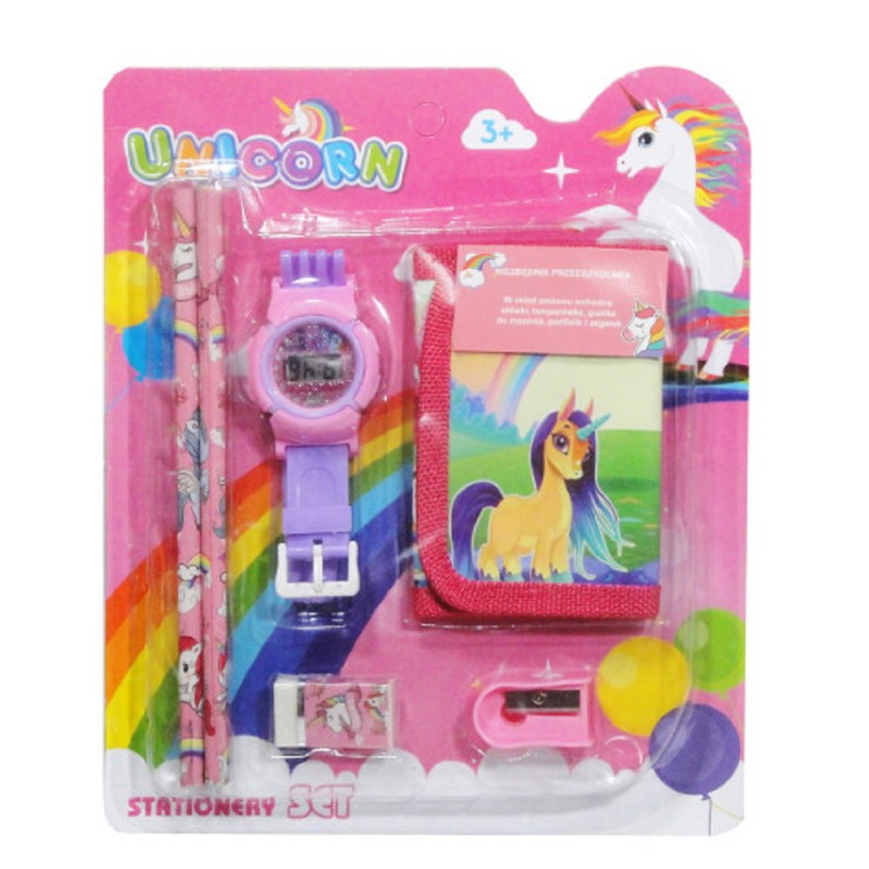 Zestaw podręczny do szkoły dla dzieci z motywem jednorożców w skład którego wchodzi: portfel, zegarek, 2 ołówki, gumka do mazania i temperówka.