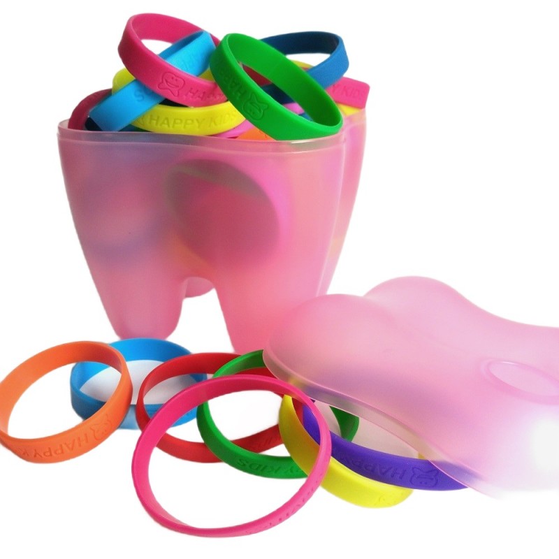 Pojemnik w kształcie zęba wypełniony 50 kolorowymi opaskami z motywem ząbka.