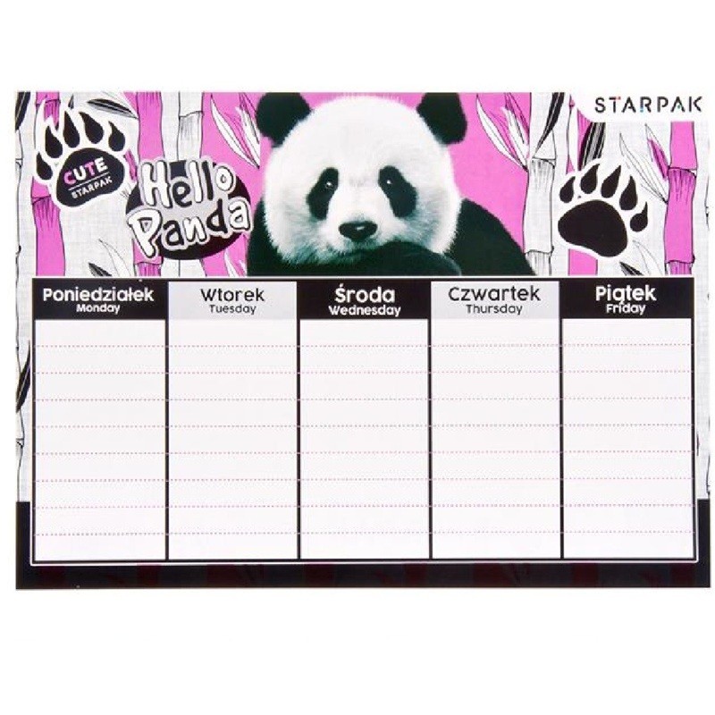 Plan z grafiką w Pandy, zawiera podział na pięć dni tygodnia z 8 wierszami do wpisu, dzięki czemu żaden uczeń nie zapomni o potrzebnych mu danego dnia książkach czy zeszytach. Grafika z Pandami sprawi, że każdy dzień w szkole będzie dobrze zaplanowany i udany. Pakowany w folię po 5 szt.(mix wzorów/kolorów)