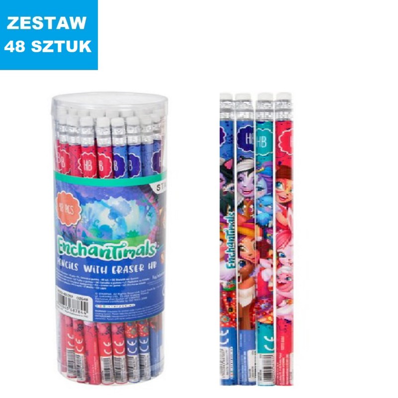Zestaw 48 ołówków z gumką zamkniętych w przeźroczystej tubie z licencją Enchantimals. Każdy ołówek zdobiony kolorową grafiką. Wykonany z trwałego drewna, zapewnia komfort rysowania i pisania. Ołówek nie łamie się podczas strugania, a gumka nie brudzi.