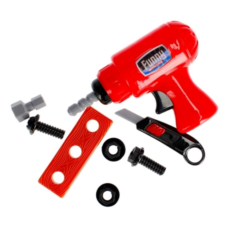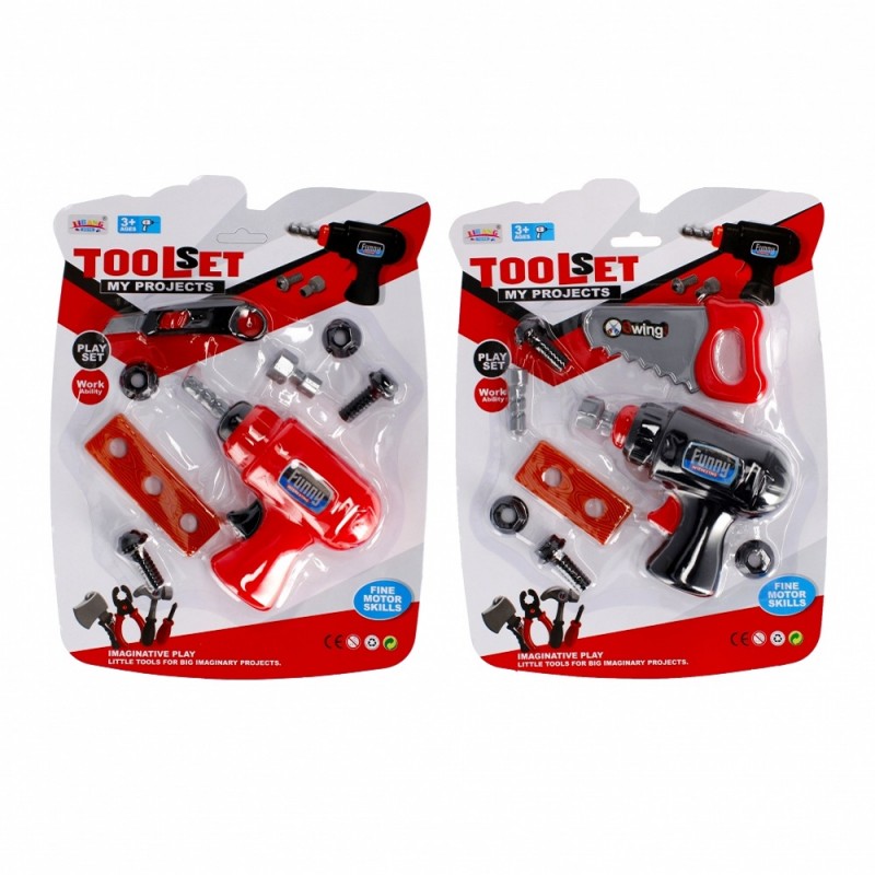 Nauka używania narzędzi warsztatowych, rozwijanie zdolności manualnych, ruchome wiertło które kręci się w dwie strony, wiertarka posiada efekt kręcącego się wiertła uruchamiany ręcznie za pomocą przyciskania włącznika. Zestaw Narzędzi to podstawowy element wyposażenia w pracy małego majsterkowicza. Dzięki niemu każde dziecko nauczy się jak przykręcać śrubki czy poprawnie wbijać gwoździe! Zawartość zestawu: wiertarka, nożyk do tapet, 2 x śrubki, 2 x nakrętki, deseczka do wkręcania śrubek. Zabawka wykonana z plastiku. Wymiary produktu w opakowaniu: 25x32x6 cm. Zestaw przeznaczony dla dzieci w wieku: 3+ . Pakowany na blistrze.