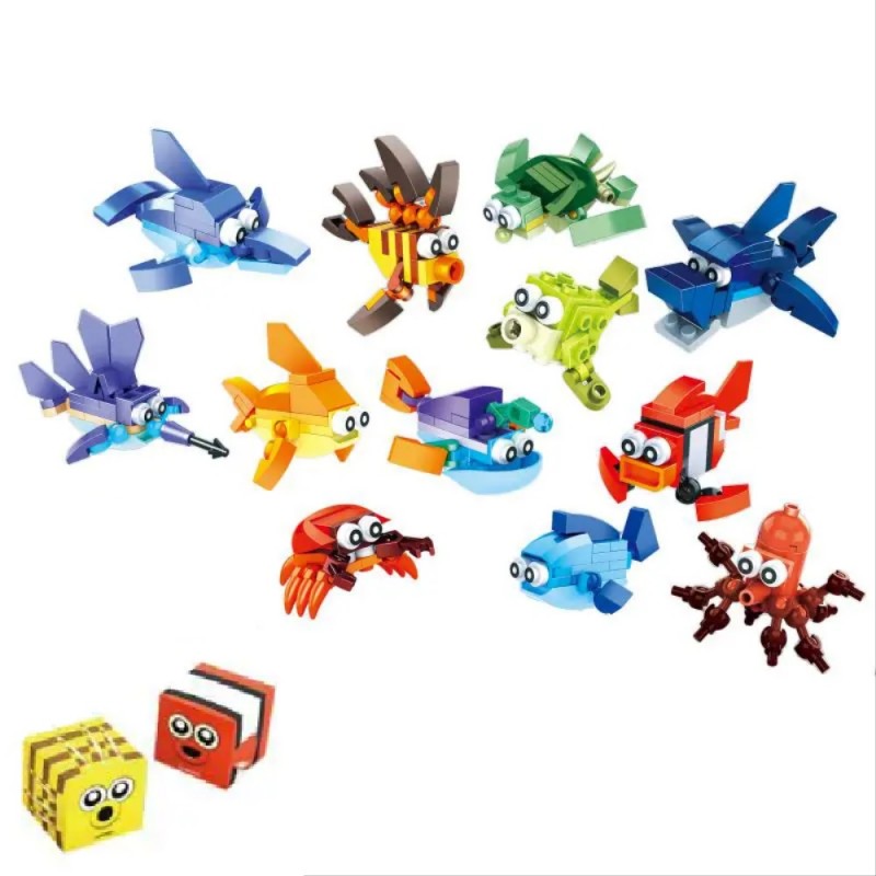 Zestaw klocków do składania w kształcie zwierzątek morskich.
