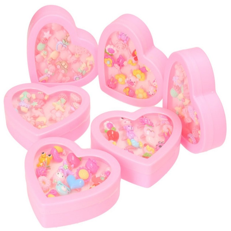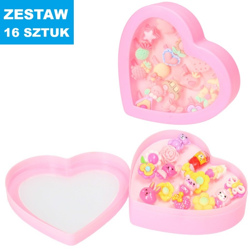 Zestaw pięknych pierścionków dziecięcych z regulacją w różowym pudełeczku w kształcie serca.
