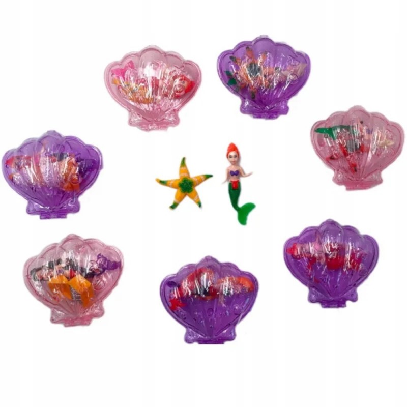 Mała lalka syrenka, zamknięta w plastikowej muszli. W zestawie z syrenką występuje jeszcze 1 figurka i to m.in.: zwierzątko morskie czy skrzynia pełna skarbów.