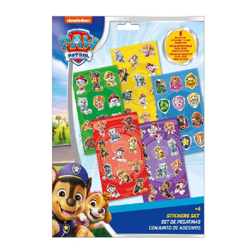 5 arkuszy z naklejkami, które przedstawiają bohaterów bajki "Psi Patrol". Naklejki są wielokrotnego użytku, dzięki czemu można je dowolnie naklejać i odklejać. To doskonały pomysł na dekorację piórnika, zeszytów, plecaka czy portfela.